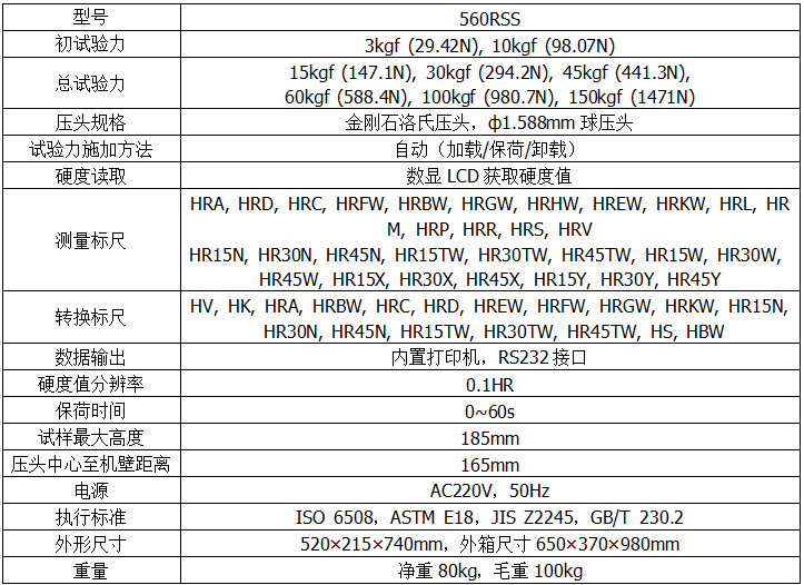 560RSS數(shù)顯雙洛氏硬度計外形新穎、功能齊全、操作方便、顯示清晰直觀、性能穩(wěn)定,是集機電于一體的高新技術(shù)產(chǎn)品,可進行洛氏、表面洛氏全部標尺的硬度測試?娠@示和設(shè)置當(dāng)前測試標尺、試驗力、測試壓頭、保荷時間、硬度轉(zhuǎn)換值、壓頭類型等,其主要功能如下:洛氏、表面洛氏硬度標尺的選擇;各硬度標尺之間的換算值;硬度測試結(jié)果可保存查看及打印輸出,自動計算最大、最小、平均值;配有RS232接口供用戶連接電腦輸出。