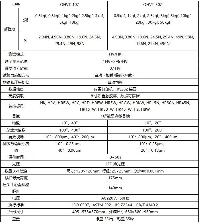 QHVT-10Z/50Z數(shù)顯維氏硬度計采用全新鋁合金壓鑄工藝,殼體堅固穩(wěn)定,新穎美觀。采用閉環(huán)式加載控制系統(tǒng),并且通過電機直驅式垂直加載試驗力,試驗力精度更高更穩(wěn)定。轉塔速度更快,測試效率高。采用特殊材質升降軸,滾珠絲杠結構,升降更平穩(wěn)。儀器采用全新8寸大屏彩色觸摸屏,顯示直觀清晰,角度任意調節(jié),操作方便。配備數(shù)顯測微目鏡,不用查表,也不用輸入壓痕對角線,在觸摸屏上直觀地顯示試驗力、壓痕長度、保荷時間、轉換標尺、時間等,操作時只要測量壓痕按目鏡按鈕,即可自動計算出硬度值并顯示在屏幕上。硬度測試結果實時保存,數(shù)據(jù)分類、可選刪除及打印輸出,自動計算最大、最小、平均值;并配有RS232接口供用戶連接電腦輸出?蛇x配LCD視屏測量裝置和CCD圖像自動測量系統(tǒng)。