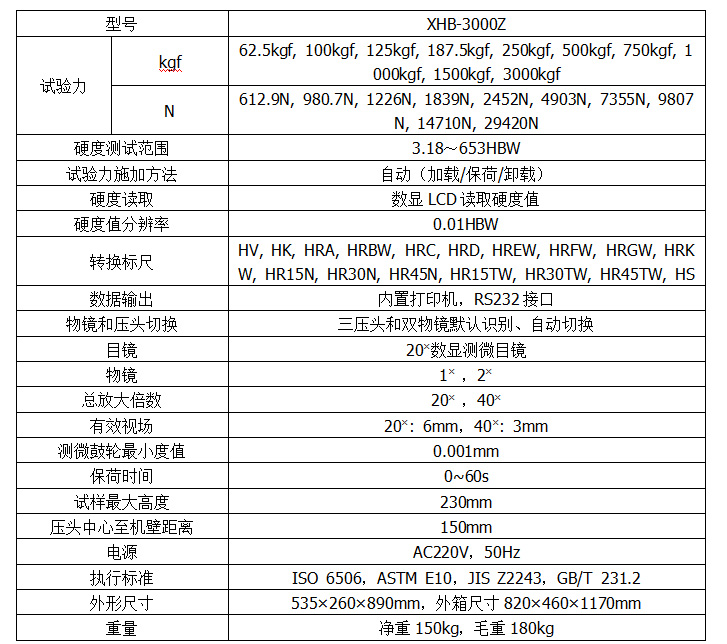 XHB-3000Z三壓頭數(shù)顯布氏硬度計(jì)采用精密的結(jié)構(gòu)設(shè)計(jì),試驗(yàn)力施加由力傳感器直接控制,使整機(jī)結(jié)構(gòu)緊湊,加卸試驗(yàn)力平穩(wěn)、準(zhǔn)確。在電氣上由CPU控制試驗(yàn)過程,物鏡和壓頭間采用自動(dòng)切換,切換定位采用機(jī)械與電子雙重配合,使定位精度更高。本儀器具備10級(jí)試驗(yàn)力,13種布氏硬度的測試標(biāo)尺,可任意選擇;具備了三個(gè)壓頭和兩個(gè)物鏡,都能自動(dòng)參與測試,物鏡和壓頭間默認(rèn)識(shí)別、自動(dòng)切換;可預(yù)置試驗(yàn)力保持時(shí)間、調(diào)節(jié)測量壓痕光源的強(qiáng)弱;顯示測量壓痕長度、硬度值、測量次數(shù)等;具備硬度標(biāo)尺轉(zhuǎn)換功能;數(shù)據(jù)結(jié)果可以保存并通過表格查看,也可通過內(nèi)置打印機(jī)輸出,并配有RS232接口供用戶連接電腦輸出。硬度計(jì)還可根據(jù)用戶特殊需求配置視屏測量裝置和CCD圖像自動(dòng)測量系統(tǒng)。