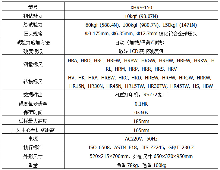 XHRS-150數顯塑料洛氏硬度計以新穎的大屏幕顯示,具有良好的可靠性、可操作性和直觀性,是集機電于一體的高新技術產品?娠@示和設置當前測試標尺、試驗力、測試壓頭、保荷時間、硬度轉換值、壓頭類型等,其主要功能如下:塑料洛氏硬度標尺的選擇;各硬度標尺之間的換算值;硬度測試結果可保存查看及打印輸出,自動計算最大、最小、平均值;配有RS232接口供用戶連接電腦輸出。