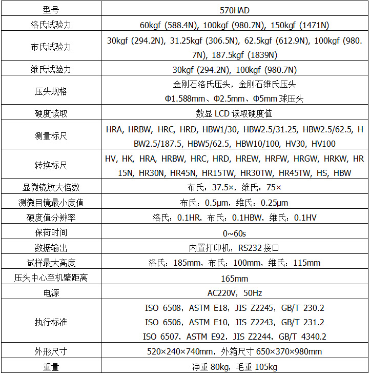 570HAD數(shù)顯布洛維硬度計(jì)外形新穎、功能齊全、操作方便、顯示清晰直觀、性能穩(wěn)定,是集光機(jī)電于一體的高新技術(shù)產(chǎn)品,可進(jìn)行布氏、洛氏、維氏三種試驗(yàn)方法測(cè)試,具備了七級(jí)試驗(yàn)力的多功能硬度計(jì),能滿足多種硬度測(cè)試需求。手動(dòng)加載初試驗(yàn)力后,總試驗(yàn)力的加荷、保荷、卸荷自動(dòng)完成,操作簡(jiǎn)便迅速?娠@示和設(shè)置當(dāng)前測(cè)試標(biāo)尺、試驗(yàn)力、測(cè)試壓頭、保荷時(shí)間、硬度轉(zhuǎn)換值、壓頭類型等,其主要功能如下:布氏、洛氏、維氏硬度的三種試驗(yàn)方法測(cè)試;各硬度標(biāo)尺之間的換算值;硬度測(cè)試結(jié)果可保存查看及打印輸出,自動(dòng)計(jì)算最大、最小、平均值;配有RS232接口供用戶連接電腦輸出。